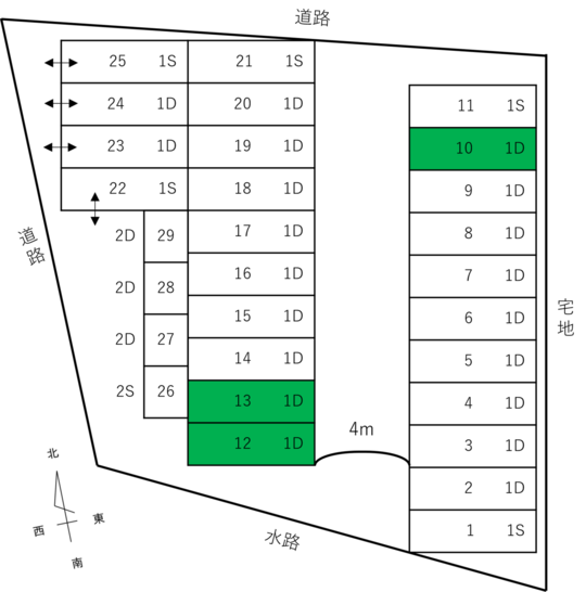 ルームタイプ: 2S【4.5畳8,580円/月・シャッタータイプ】 2D【4.5畳8,580円/月・ドアタイプ】 1S【9畳10,780円/月・シャッタータイプ】 1D【9畳10,780円/月・ドアタイプ】